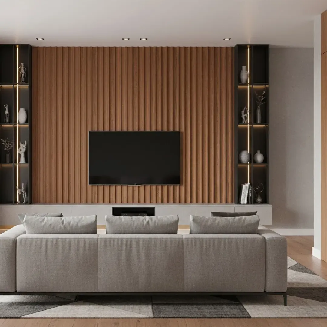 El panel WPC para interiores está compuesto por un 60% de resina de madera y un 40% de PVC, y está acabado con un revestimiento de alta calidad que ofrece texturas realistas y colores sólidos para adaptarse a cualquier estilo de decoración.