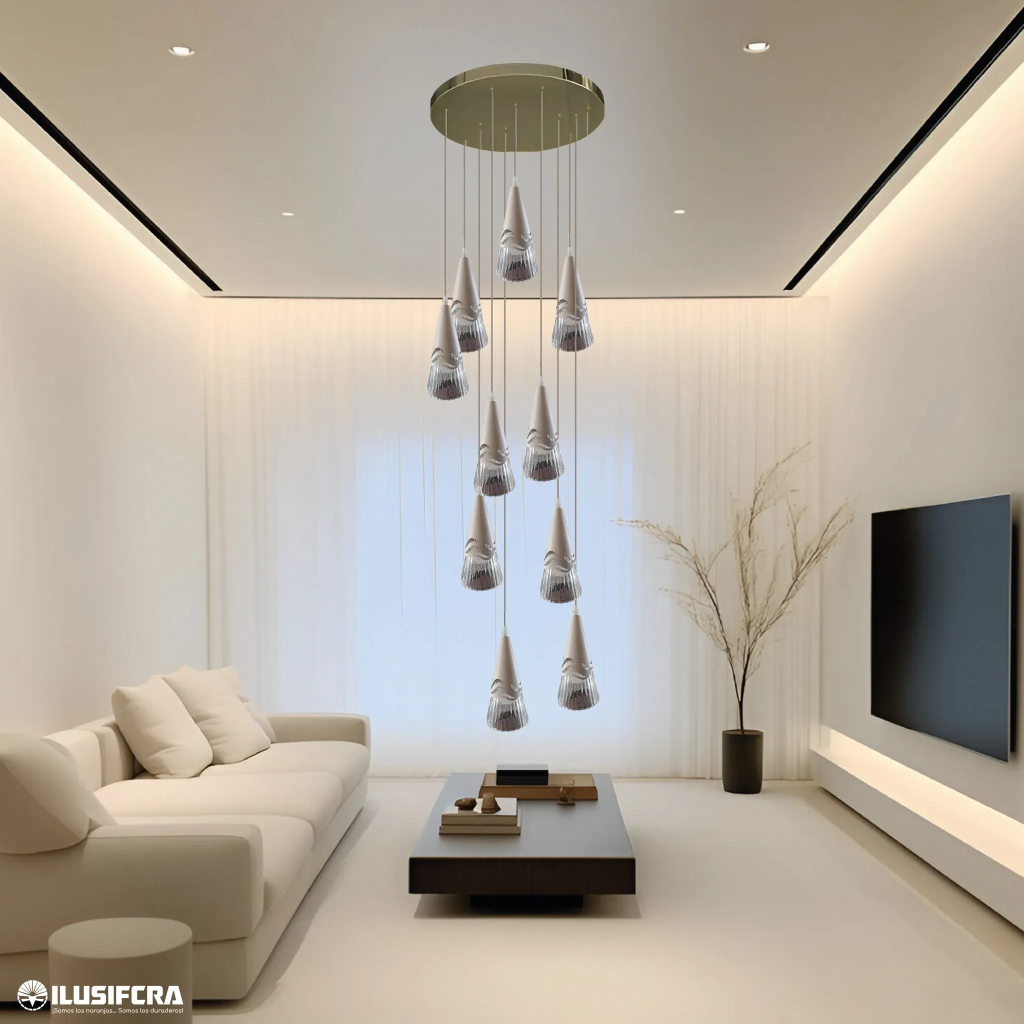 diferentes niveles aporta dinamismo visual y un estilo sofisticado, ideal para salas, comedores o espacios de doble altura. Con una iluminación
