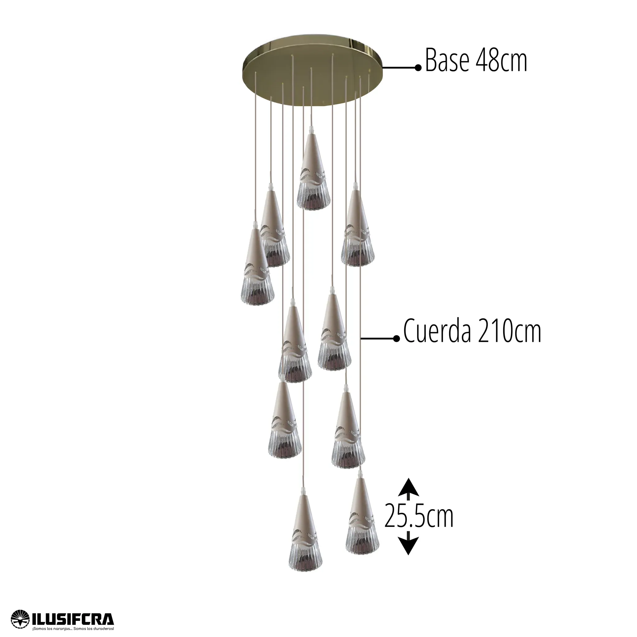 La lámpara de colgar 1201-10 cono doble altura combina modernidad y diseño elegante en una pieza única. Su estructura de conos suspendidos en