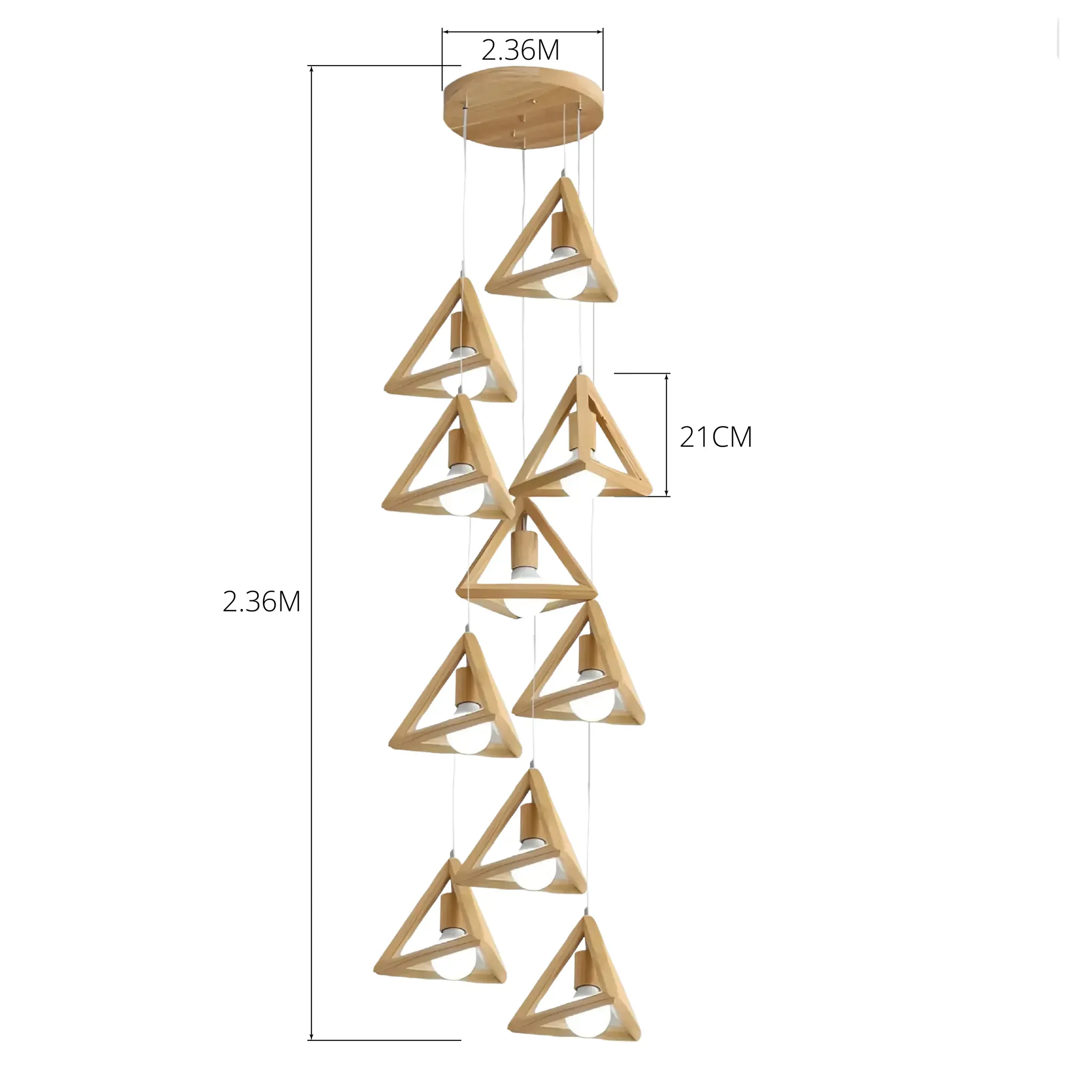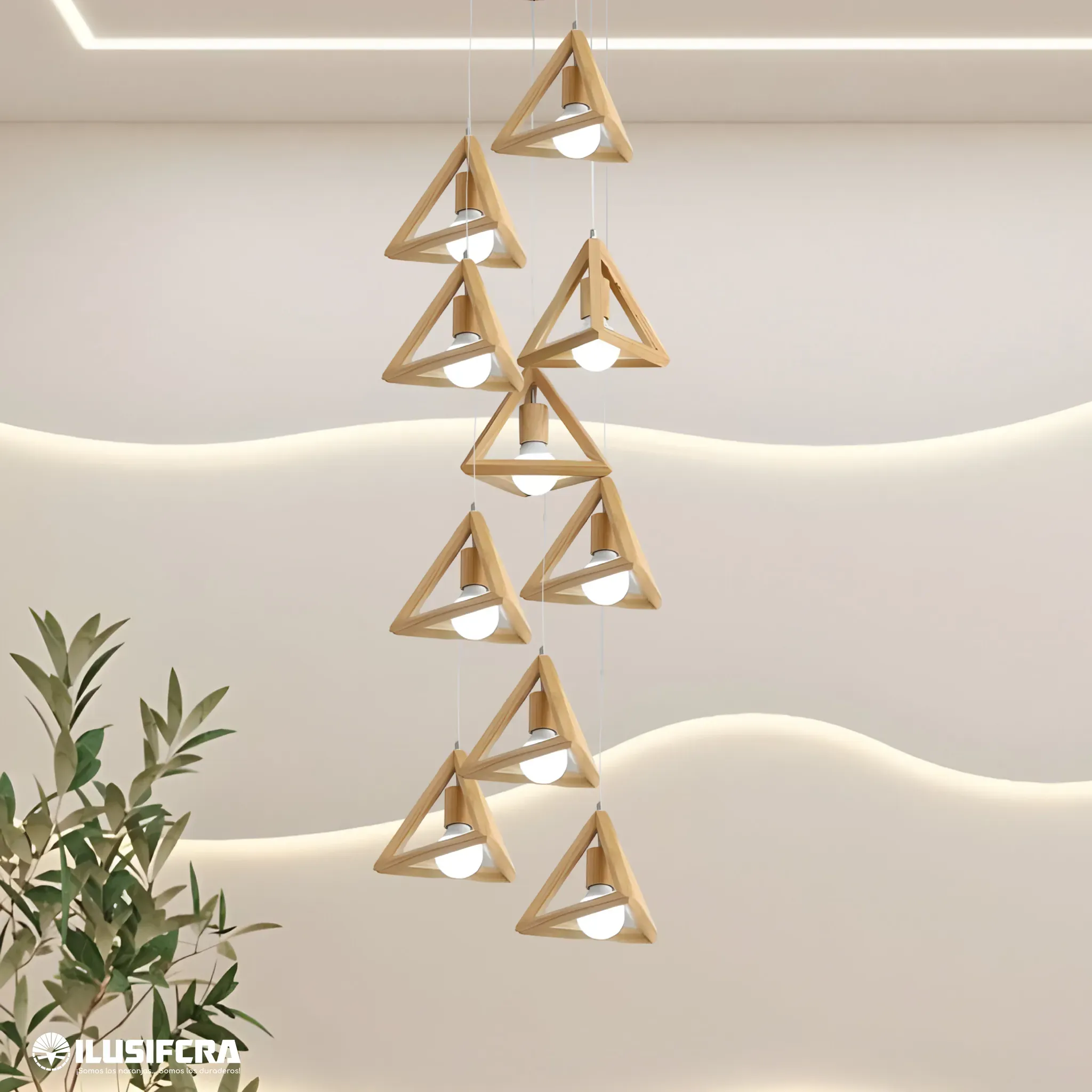 La Lámpara de colgar doble altura con figuras de triángulo en nadera combina diseño geométrico y calidez matural en una pieza única. Su estructura