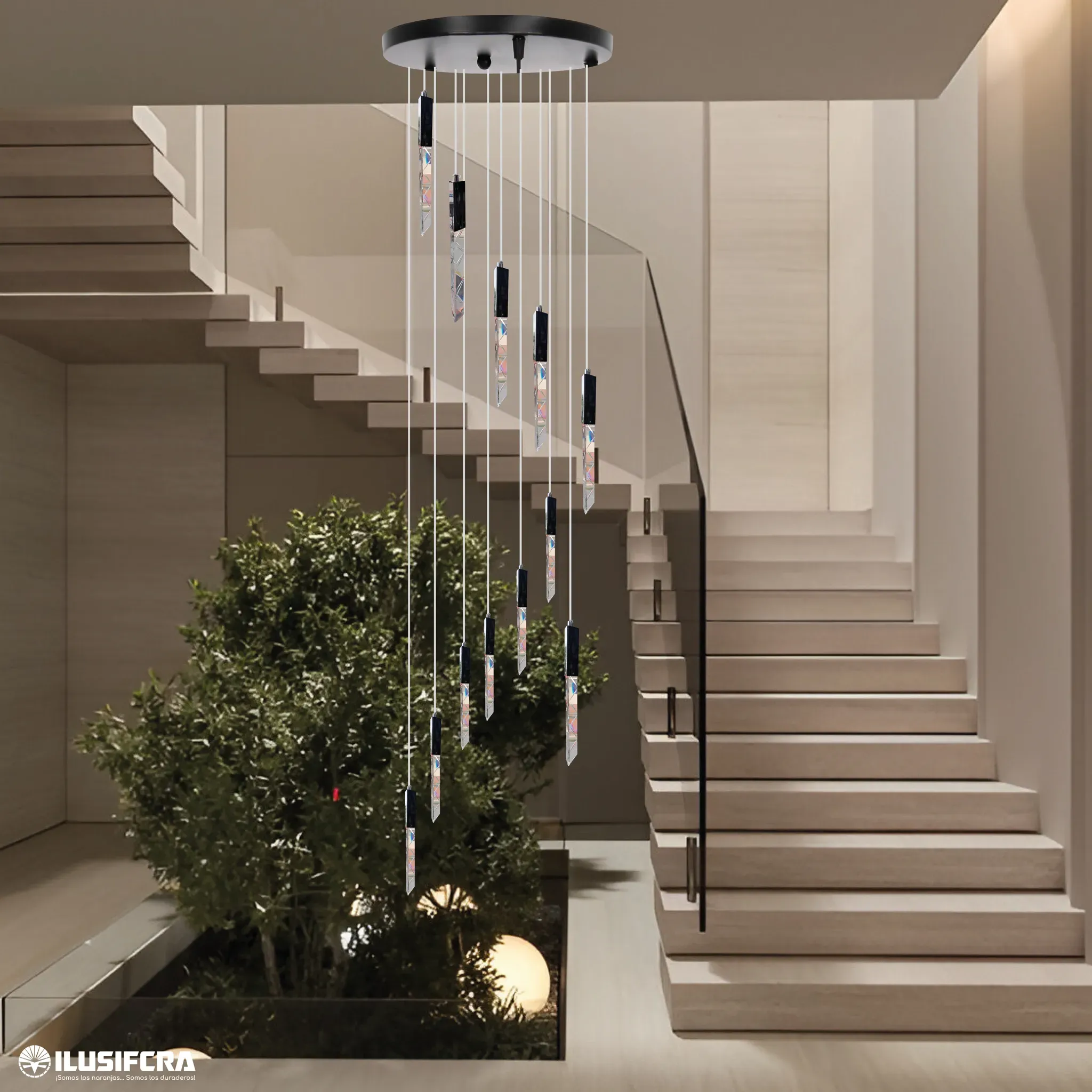filamentos de cristal crean un juego de luces elegante y moderno, aportando calidez y distinción. Ideal para salas, comedores o áreas sociales con